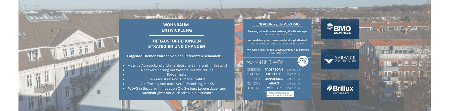 Im Rahmen unserer aktuellen Vortragsreihe im November 2025 in Paderborn, Bielefeld, Osnabrück, Ahaus und Münster durften wir gemeinsam mit Experten der Firma BMO KS-Vertrieb und Brillux einen umfassenden Blick auf die Chancen und Herausforderungen des Bauens im Bestand werfen.